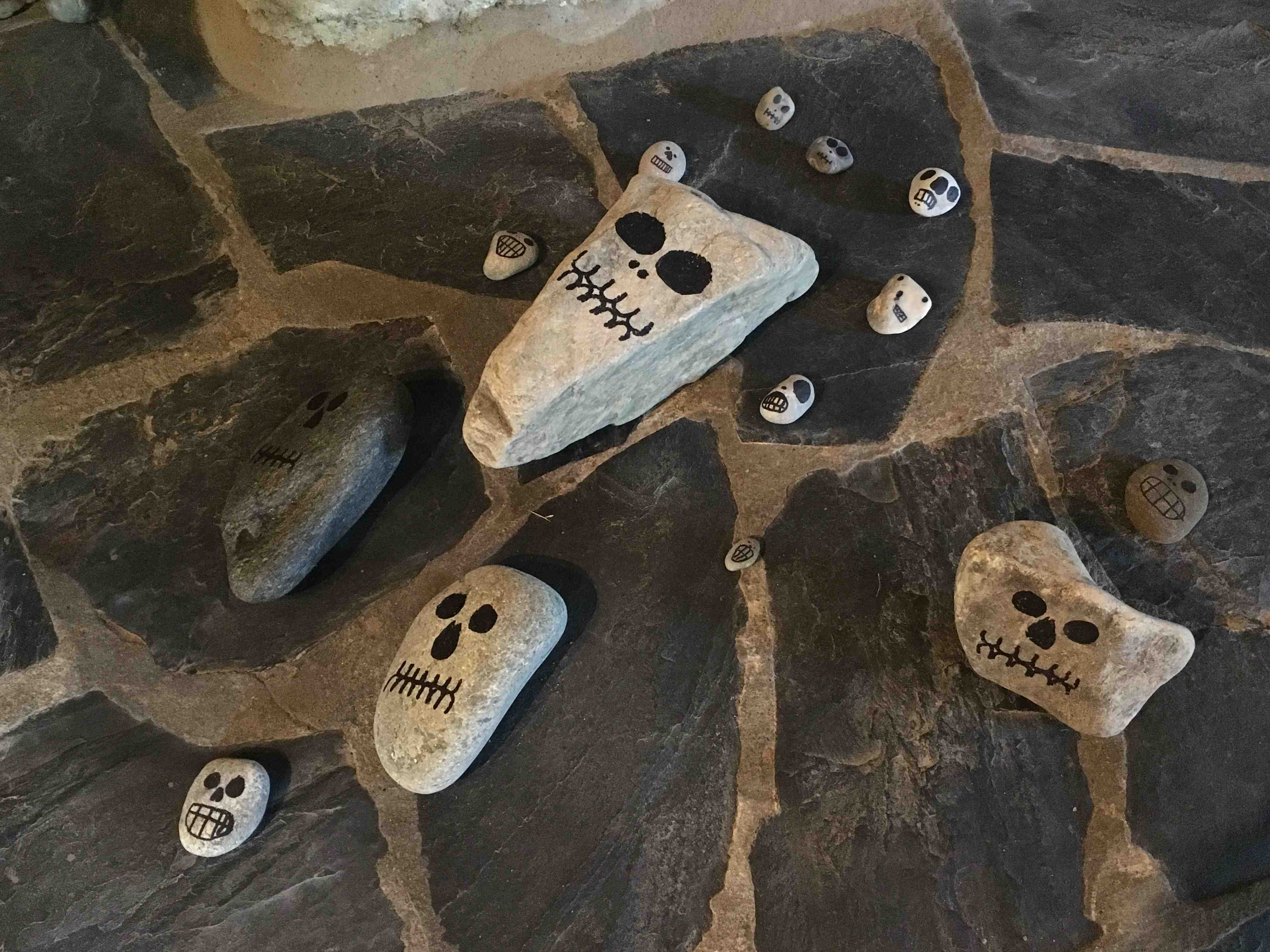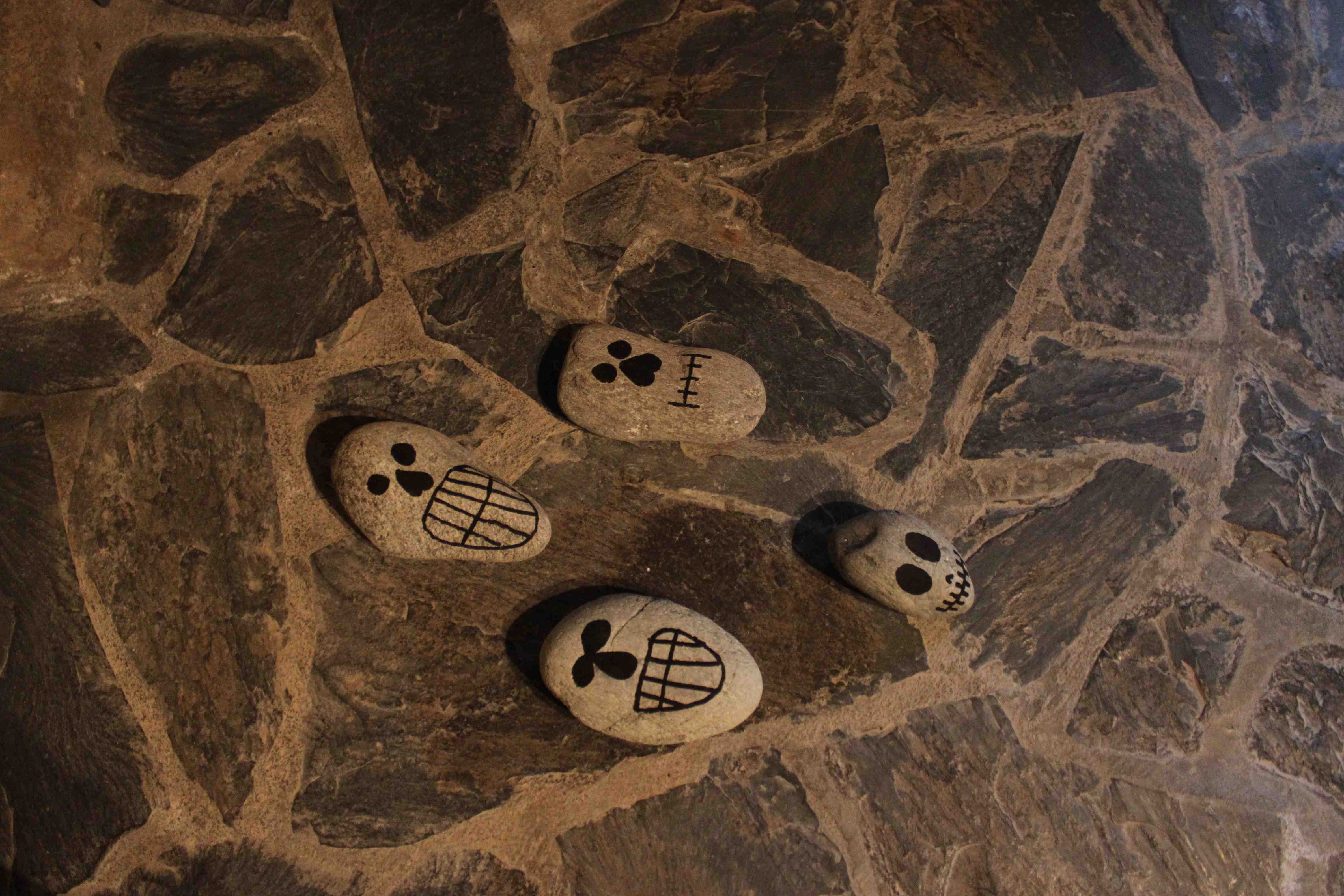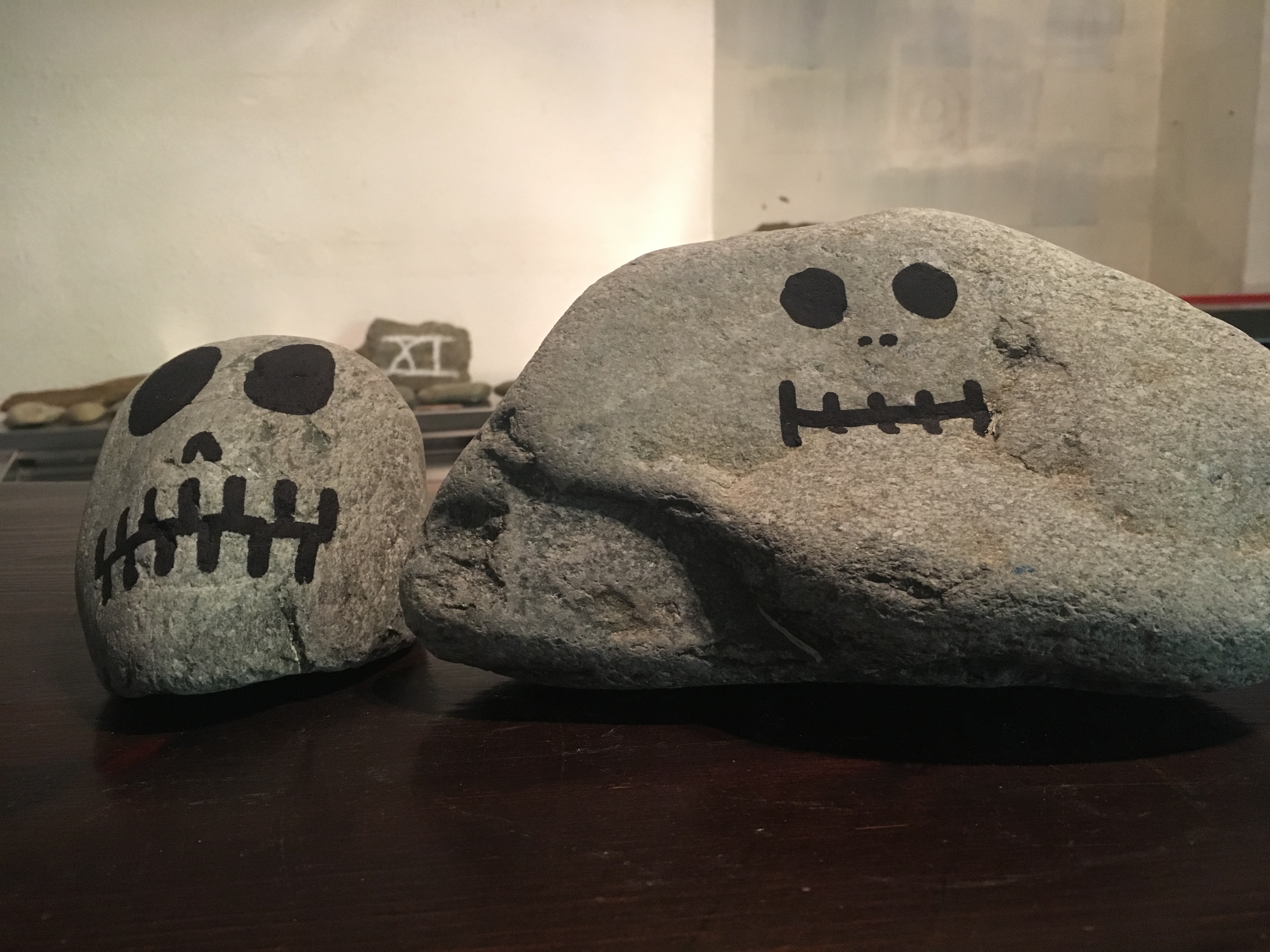 La exposición muestra el resultado de dibujar sobre las piedras, procedentes de distintos lugares, cráneos, que terminan siendo caras incluso amables, por la necesidad propia de avanzar hacia algo, de muerte a vida, de piedra a animal o humano.